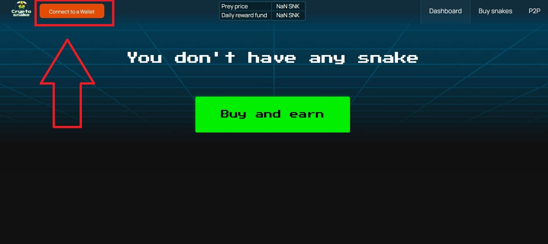 If this is your first time on the site, you will be offered to buy a snake - Buy and Earn. However, first, we need to attach the wallet. Without this, the big green button will not work. So click Connect Wallet.
